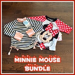 Super cute Disney shirt featuring Minnie Mouse with red polka dots. Includes a stylish striped top with pink/navy/white accents - both are rash guard tops. Minnie is marked 3T & Striped is marked 115, which is a small 4-6. Both brand new with tags. One owner~