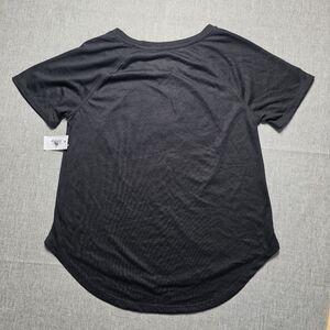 The fabric is a soft, breathable Polyester/Rayon blend with a slightly athletic feel, making it perfect for a day of walking around the parks. It features a flattering fit with raglan sleeves and a stylish curved, high-low hemline.