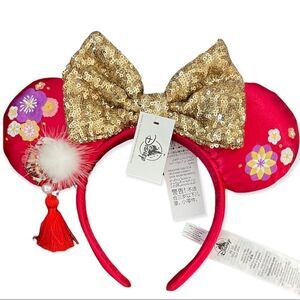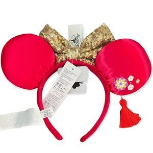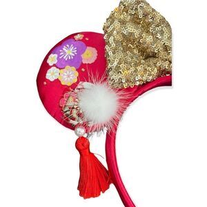 This red ear headband features embroidered flower appliqués on the ears, as well as a gold sequined bow and a matching red tassel with faux pearl accents.