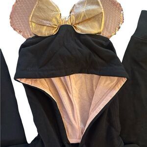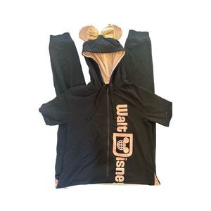This stylish and cozy Walt Disney World one-piece jumpsuit is perfect for Disney lovers! Featuring a black design with rose gold accents, it has a hood with Minnie Mouse ears and a sequin bow, adding a magical touch. The Walt Disney World logo runs down the leg, making it a standout piece.