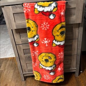 Soft fleece blanket with cheerful Winnie the Pooh design. Features red background with yellow Pooh faces and white snowflakes.