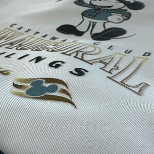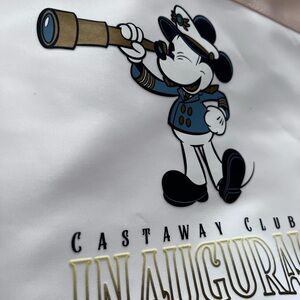 Tote bag is the pertect beach or pool Tote bag, top zipper closure with Disney Cruise Line cut out metal pull, fully lined with Castaway Club logo, 1 interior pocket. Front of Tote bag features Mickey Mouse in Captains gear looking through monocular with Castaway Club Inaugural Sailings Disney Wish with logos.