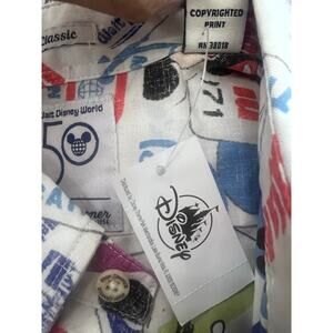 NWT (New With Tags) Walt Disney World 50th Anniversary Reyn Spooner Hawaiian Shirt! This unworn, collectible Men's Aloha Camp Shirt comes in pristine condition with original tags intact, making it a highly sought-after piece for serious collectors. It features a vibrant, all-over print (AOP) showcasing iconic Disney Parks memorabilia, including retro Walt Disney World logos, the "D" icon with Mickey silhouette, and "October 1, 1971" – the park's opening day. Crafted with Reyn Spooner's signature quality and style, this limited edition Disney Parks exclusive is perfect for Disney enthusiasts, Hawaiian shirt collectors, and fans of classic Mickey Mouse and the Vacation Kingdom of the World. A truly special item for your next Disney vacation, cruise, or as a premium statement piece."