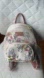 Charming mini backpack with floral and character design. Features pink and gold accents. Vegan leather