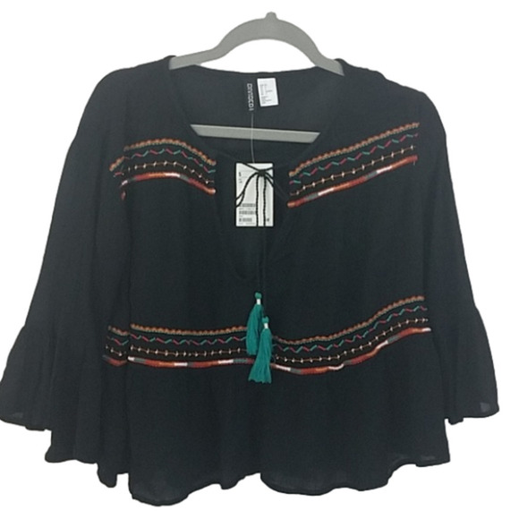 𝅺NWT Divided H&M boho blouse sz 4 tassle embroidery
