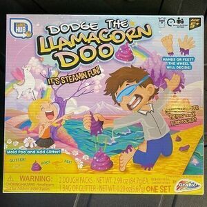 includes poo walk floor mat (wipeable), game spinner, 2 packs of dough, 1 blind fold, 1 bag of glitter, 1 llamacorn poo mold (2 poo shapes), instructions