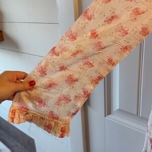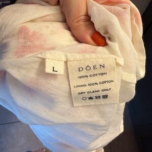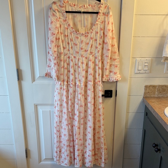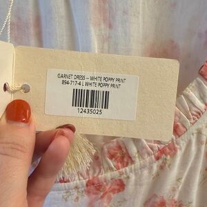 Gorgeous Doen dress. Sought after Garnet Dress in White Poppy Print. Side zipper. Sweet pintucked ruffle neckline. One tier in the skirt. No pockets. Skirt is lined but bodice and sleeves are sheer.