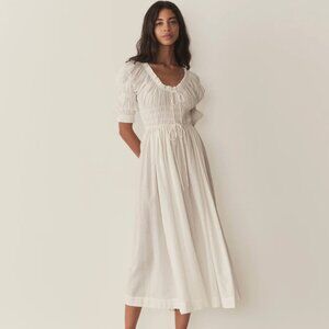 In a soft, lightweight blend of organic cotton and viscose, our beloved Ischia Dress—a Favorite Character that first made its debut in Spring 2021—features double-puffed sleeves and a scoop neckline adorned with petite ruffles and a functional center tie. A smocked bodice with an adjustable waist tie gives way to an ankle-grazing A-line skirt.