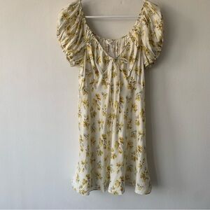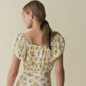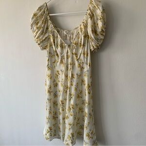 NWT Doen Sera Silk Short Puff Sleeve V Neck Mini Dress Gold Frolicking Floral