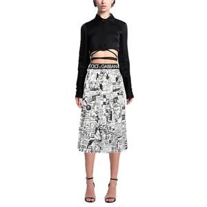 White pleated skirt from Dolce & Gabbana. Made of silk, this design features a back zip and hook, black elastic waistband embroidered with a white logo, black print.