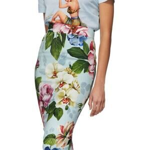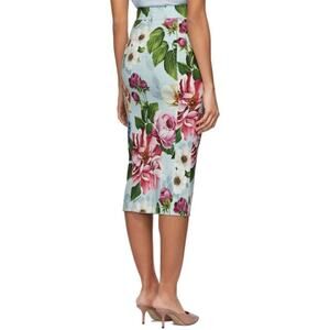 floral-print midi skirt from Dolce & Gabbana. It features a high-waisted, fitted, and straight silhouette. The floral print includes large flowers in shades of pink, white, and blue on a light blue background. The skirt has a covered zip in the center back and is made in Italy.