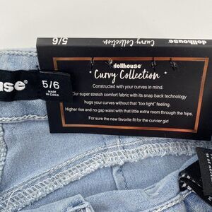 The Dollhouse High Rise Slim Flare Light Wash Curvy Jeans in size 5/6 with a waist of 25 inches and an inseam of 33 inches are a stylish and flattering choice for women. Made from denim fabric with a light wash, these jeans feature a high-rise waist and a slim fit, perfect for creating a curvy silhouette. The flared style adds a trendy touch to the classic blue color, while the zip closure and pockets offer both functionality and comfort. Perfect for everyday wear or dressing up for a night out, these Dollhouse jeans are a versatile addition to any wardrobe.