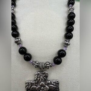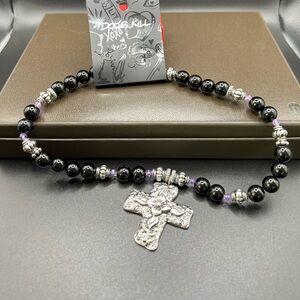 NWT Dolls Kill Divine Nature Cross Necklace Black beads w/ purple crystals