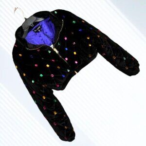 cuz you are a precious gem on this planet! Bedazzle the world in this quilted velvet puffer jacket. Long sleeves, fully lined, sewn on jewels, cropped fit, zip front (goldtone) in gorgeous black! Well made, nice and thick, beautiful multicolored jewels and tons of presence! Sold out everywhere!