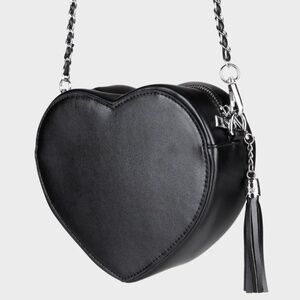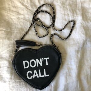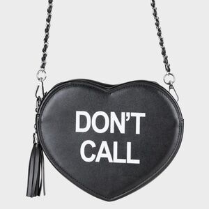 This heart-shaped crossbody bag has a vegan leather construction, removable chain strap, a top zip closure with a tassel charm pull, and "don't call" slogan graphics at front."