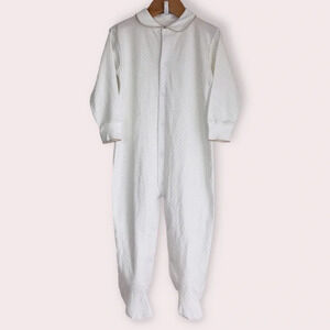 White long sleeve footed one piece outfit with tiny taupe polka dots, snap front, embroidered edge Peter Pan collar and cuffs, 100% Pima cotton, gender neutral, toddler boy, toddler girl, romper, coverall, sleeper, pajamas.