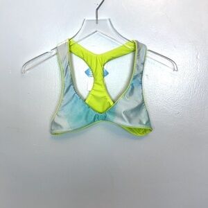 Don't Blow the Illusion by Amara reversible racerback bikini top. Style is slip-on, over the head, no clasps nor adjustable straps. One side of the bikini top is light blue/pinkish mix and the other side is highlighter green.The black tag can be pushed to the front or back to make the bikini completely reversible. Top is brand new with tags and is size XS.