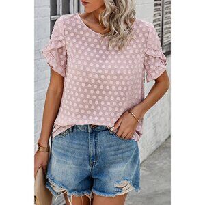 Features: Swiss Dot Round Neck Ruffle Loose Solid Top