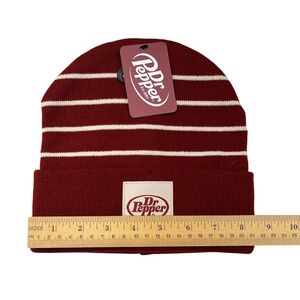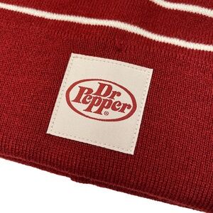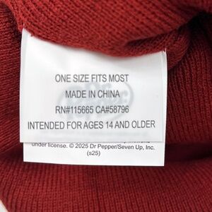 Dr. Pepper Cuffed Knit Beanie. There is no fabric tag in this hat, but it feels like acrylic. 3-inch cuff that is sewn down.