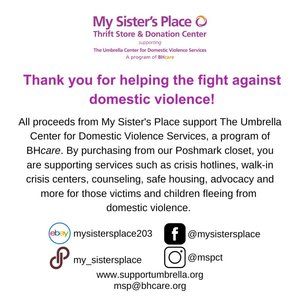 Thank you for choosing to support My Sister’s Place. All profits from this sale are used exclusively to provide services to victims of domestic violence and their families through BHcare’s Umbrella Center for Domestic Violence Services (UCDVS). Thank you for helping victims live better lives.