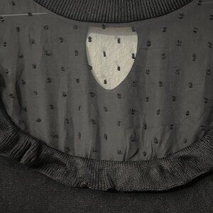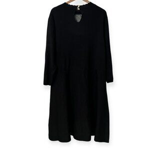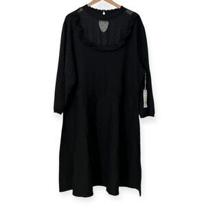 Elegant black knit fit & flare dress by Draper James RSVP. Sheer Swiss dot mesh yoke, ruffle trim, 3/4 sleeves, plus size 3X. Perfect for work, dinner, or special occasions.