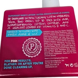 Be drenched in PINK! Creamy lotion hydrates your bod from tip to toes with super softening cotton complex and a healthy combo of vitamins E and C. Smells so clean with fresh apples and lily.