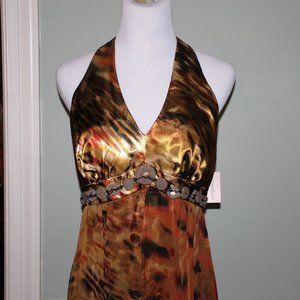 100 per cent silk, great animal print, with wooden button accents. Sweet piece, new, never worn. Beautiful copper colored lining.