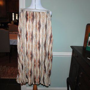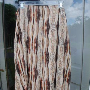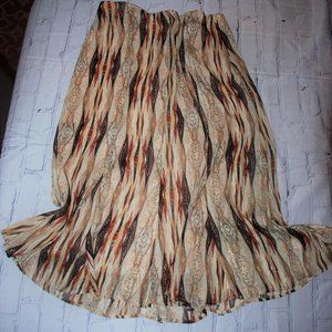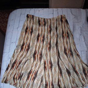 Pictures don't the pretty gold and silver threads running through this skirt. They are subtle but do give off a glimmer. Earthy tones in the print. Polyester