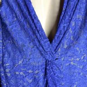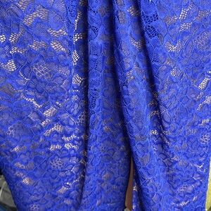 Elegant blue lace overlay. Sleeveless design. Perfect for special occasions.