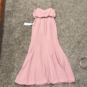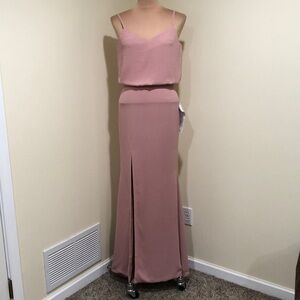 New with tags no flaws. Sleeveless, adjustable spaghetti strap, blouson top, sheath silhouette full length gown with off center thigh high front slit. Blush pink. Zips in back. Slight stretch.