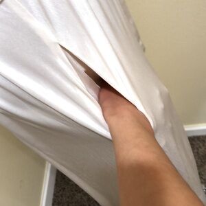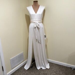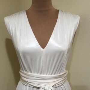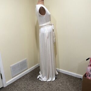 New with tag no stains rips or fading. Sleeveless, v-neck, fit and flare gown with thigh high slit with hidden side pockets. No padding or boning. Very stretchy. Zips in back. The belt is not detachable and can be tied in the front or back. Shimmery off white color.