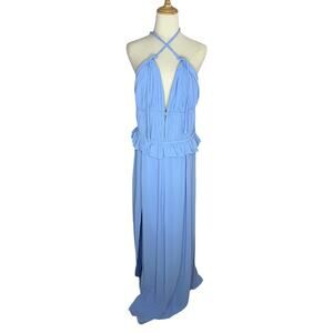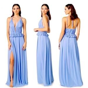 NWT Dress the Population Athena Plunge Flowy Cut Out Blue Maxi Dress Gown High Cut