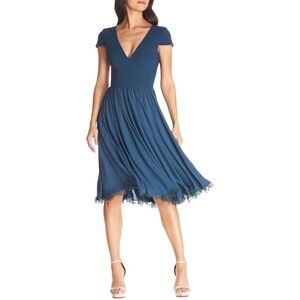 NWT Dress the Population Corey V Neck Short Sleeve Chiffon Lace Trim Mid…