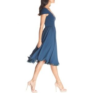 The charming but sophisticated Corey dress in Peacock Blue pairs a fitted crepe bodice with a softly gathered chiffon skirt. Cap sleeves add coverage to balance the sultry plunging v-neckline and curved v-back of this design. A scalloped lace hem dresses up the midi-length skirt for special events.