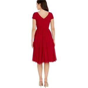 The charming but sophisticated Corey Dress pairs a fitted crepe bodice with a softly gathered chiffon skirt. Cap sleeves add coverage to balance the sultry plunging v-neckline and curved v-back of this design. A scalloped lace hem dresses up the midi-length skirt for special events.