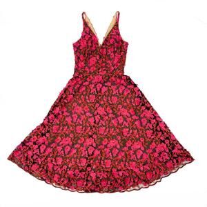 Light-weight mesh fabric serves as a striking base for the allover floral embroidery. This flattering fit and flare sleeveless dress features thin straps and a plunging neckline. A playful scalloped lace hem on the cocktail-length skirt makes for a modern romance finish.