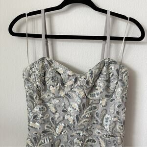 Elegant midi dress with intricate multicolor embroidery. Spaghetti straps and fitted bodice. Perfect for special occasions.