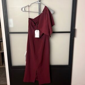 New with tags S (4/6) The Tiffany is an elegant asymmetrical dress made in our stretch crepe material in Burgandy. A large bow drapes over the single shoulder strap. The form-fitting silhouette has a straight, midi-length skirt that tapers in at the waist completed with a back slit. Fully Lined, Side Zipper, Back Slit 9 1/2" Bodycon Silhouette Self: 97% Polyester 3% Spandex Lining: 100% Polyester 44 ½” Length from HPS Hand Wash Cold. Do Not Bleach. Line Dry, Low Iron Inside Out If Needed. Can Be Dry Cleaned. I