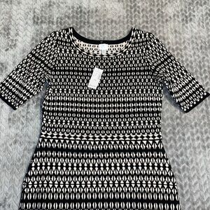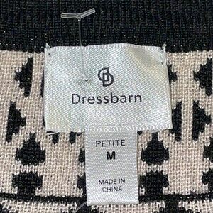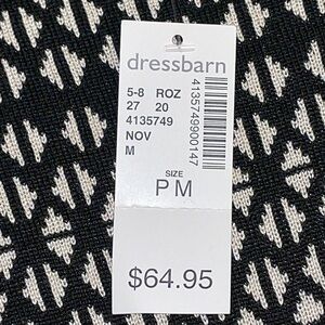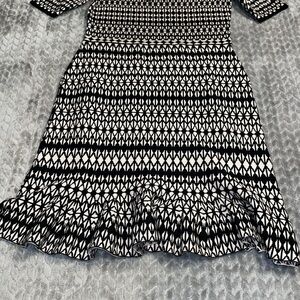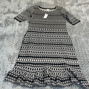 NWT Dressbarn Women's Geometric Print Knit Dress. Size Medium Petite. Ruffle. Black/White. Bottom ruffle. Medium weight dress. Short sleeve.