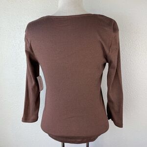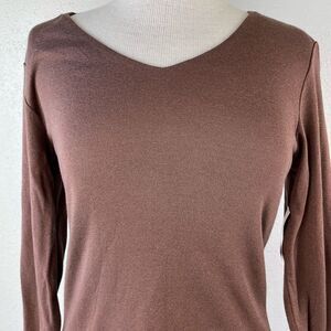Classic Dressbarn top featuring a v-neck and subtle metallic shimmer. It measures 17 inches armpit to armpit and 23 inches in length from shoulder to hem.