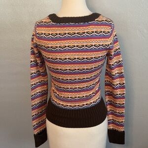 Duck Head multi-color long sleeve sweater in size small. This could be a Junior size, so please see measurements below. Cuffs, neckline and hem are all ribbed brown. Other main colors are blue and orange. Item is new with tags.