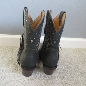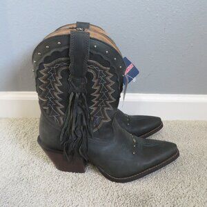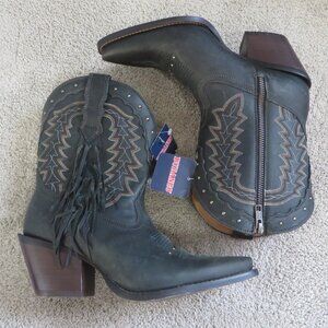 This style is full-grain leather with a faux shaft and beautiful fringe details. It has a soft mesh lining, antiqued silver studs and includes a medial side zipper for easy on/off and the Durango® Sole Comfort Footbed™.