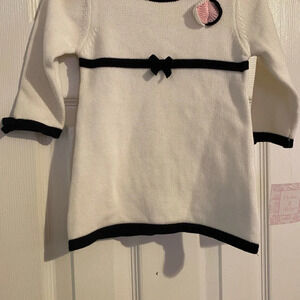 White long sleeve sweater dress with black trim and pink flower 🌸
