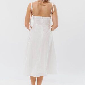 This EB Luxe White Midi Dress in XL is NWT. The lightweight dress has self tie straps with tassles featuring gold bead accents. The bodice is bustier style with boning that is stretchy in the back. Dress is 70% cotton and 30% linen and the lining is 100% cotton. NWT