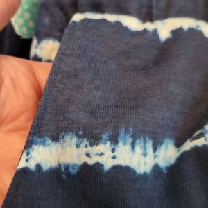 Both have elastic tie waists. NWT pair has pinepples on it, EC pair is tiedyed. Both have pockets. Measurements for Pineapple pair: Waist-14" from side to side, but is elastic, so it will stretch if needed. Hips-16" from side to side. Inseam-3". Length from top to bottom-11". Measurements for tiedyed pair are the same as the pineapple pair. Materials for Pineapple pair-100% Cotton. Tiedye pair is 60% Cotton, 40% Polyester.