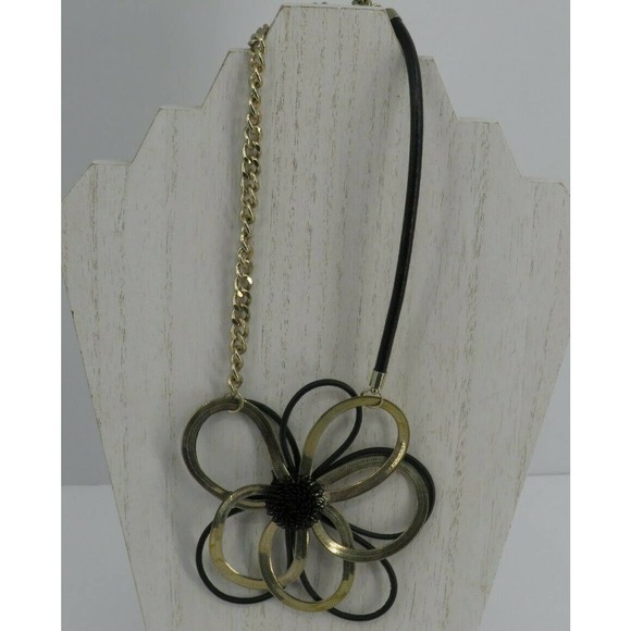 NWT EFM NECKLACE & EARRING SET Gold Tone Chain Faux Leather Statement Flower