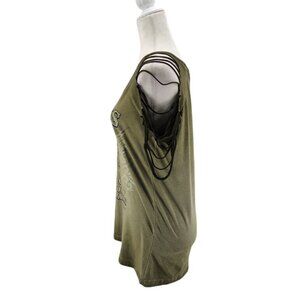 Short sleeve top - shade of distressed green. Decorative cut-outs on the sleeves. Sturgis 82nd Motorcycle Rally 2022 Feel The Freedom spelled out on the front with wing graphics. material has a stretch. 95% Cotton & 5% Spandex. Made in Turkey. Sturgis Black Hills Rally, motorcycle, biker, bike