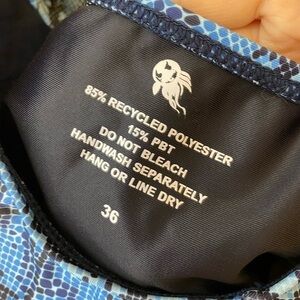 e-ko beach one piece swimwear. Racerback style. Blue snake print design. Eco conscious manufacturing. Size 36 equals size 6-8. New! (W)