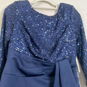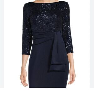 ELIZA J Navy Sequin Bodice Stretch Knit Skirt Pleated Bow Detail Maxi Gown size 8