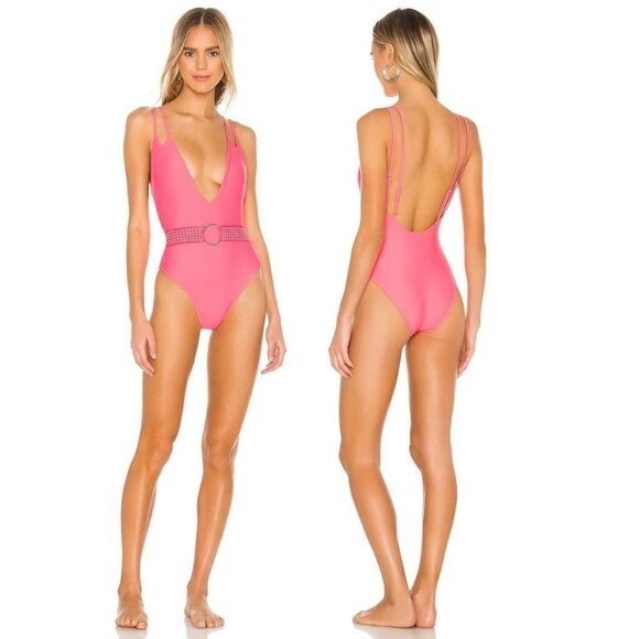 NWT ELLEJAY Coco One Piece Swimsuit Deep V-Neck with Metallic Ring Belt Pink M